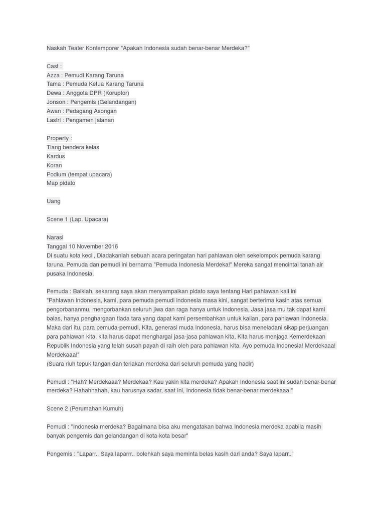 NASKAH TEATER TRADISIONAL MODERN DAN KON DOC Contoh naskah drama proklamasi untuk 10 orang Ayu Mentari - Academiaedu. Daya kreativitas Rendra cukup tinggi ia tidak menggunakan konsep yang statis dalam penyutradaraan. Lalu drama seperti apa yang kalian pentaskan.